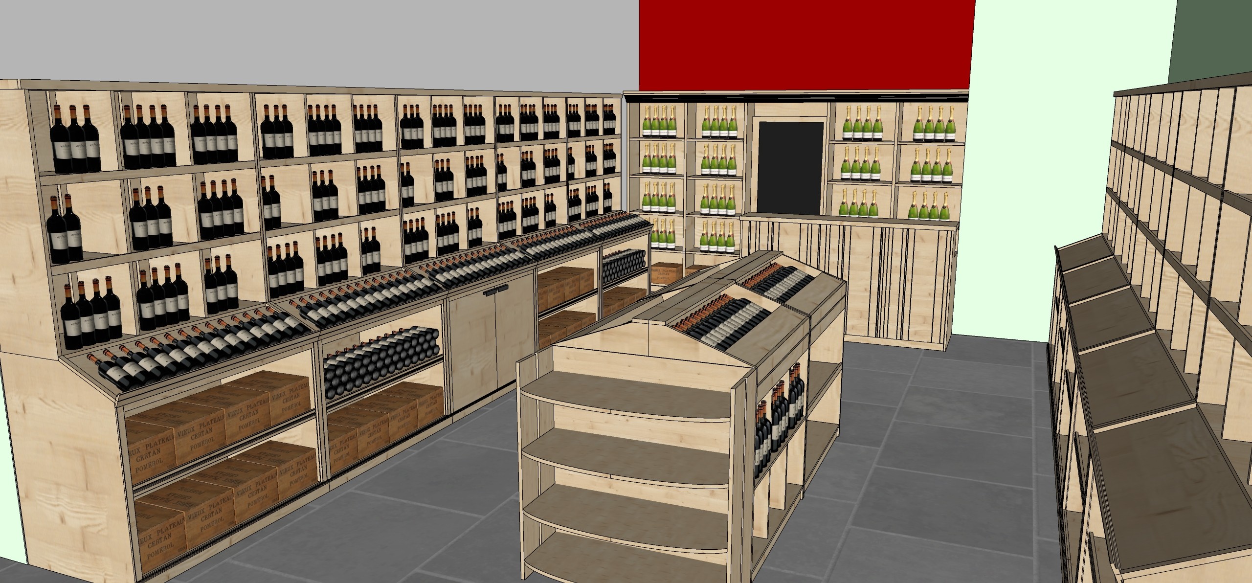 Des linéaires muraux avec casiers conçus pour structurer l’offre et permettre une présentation en double facing des bouteilles