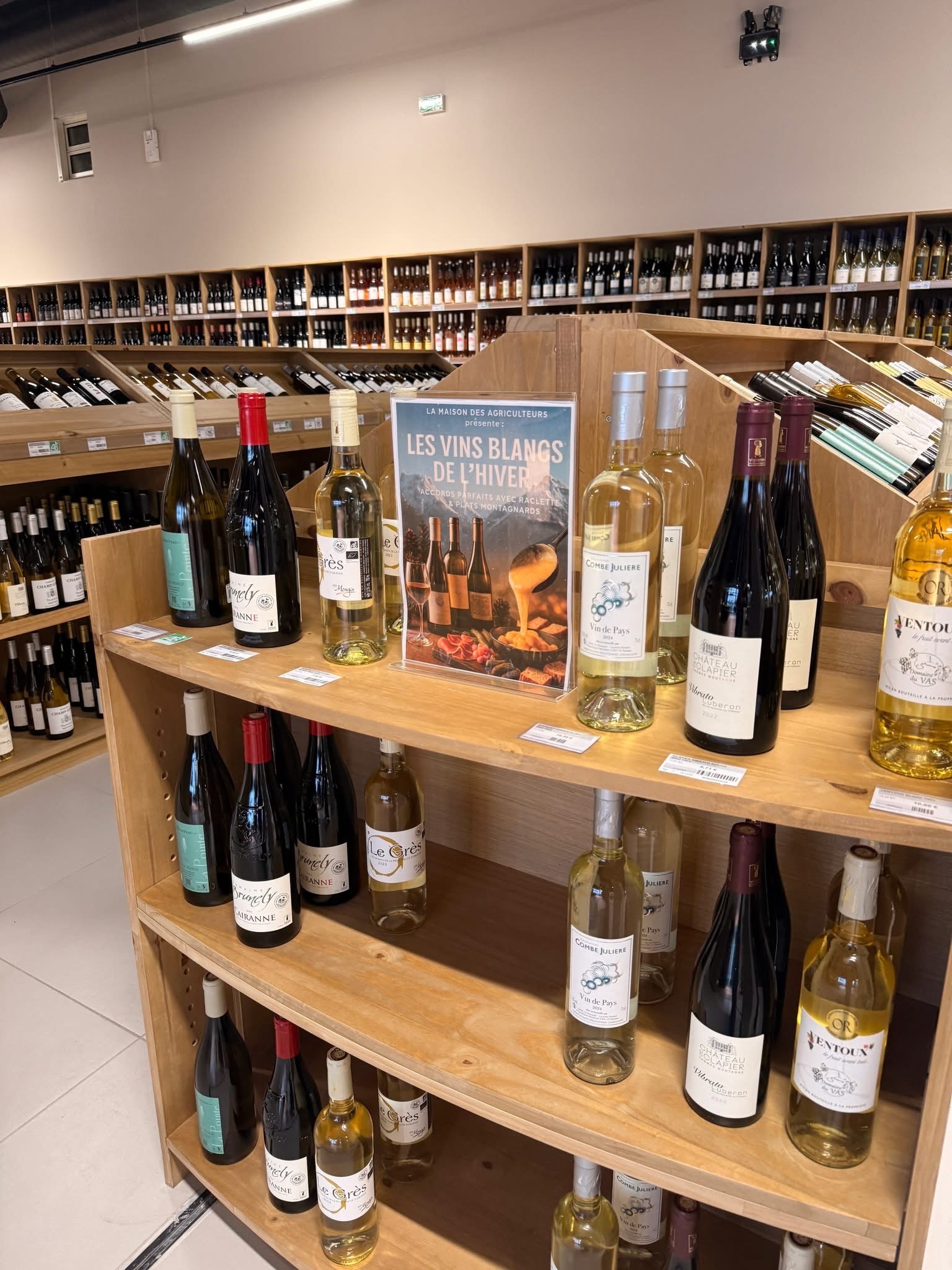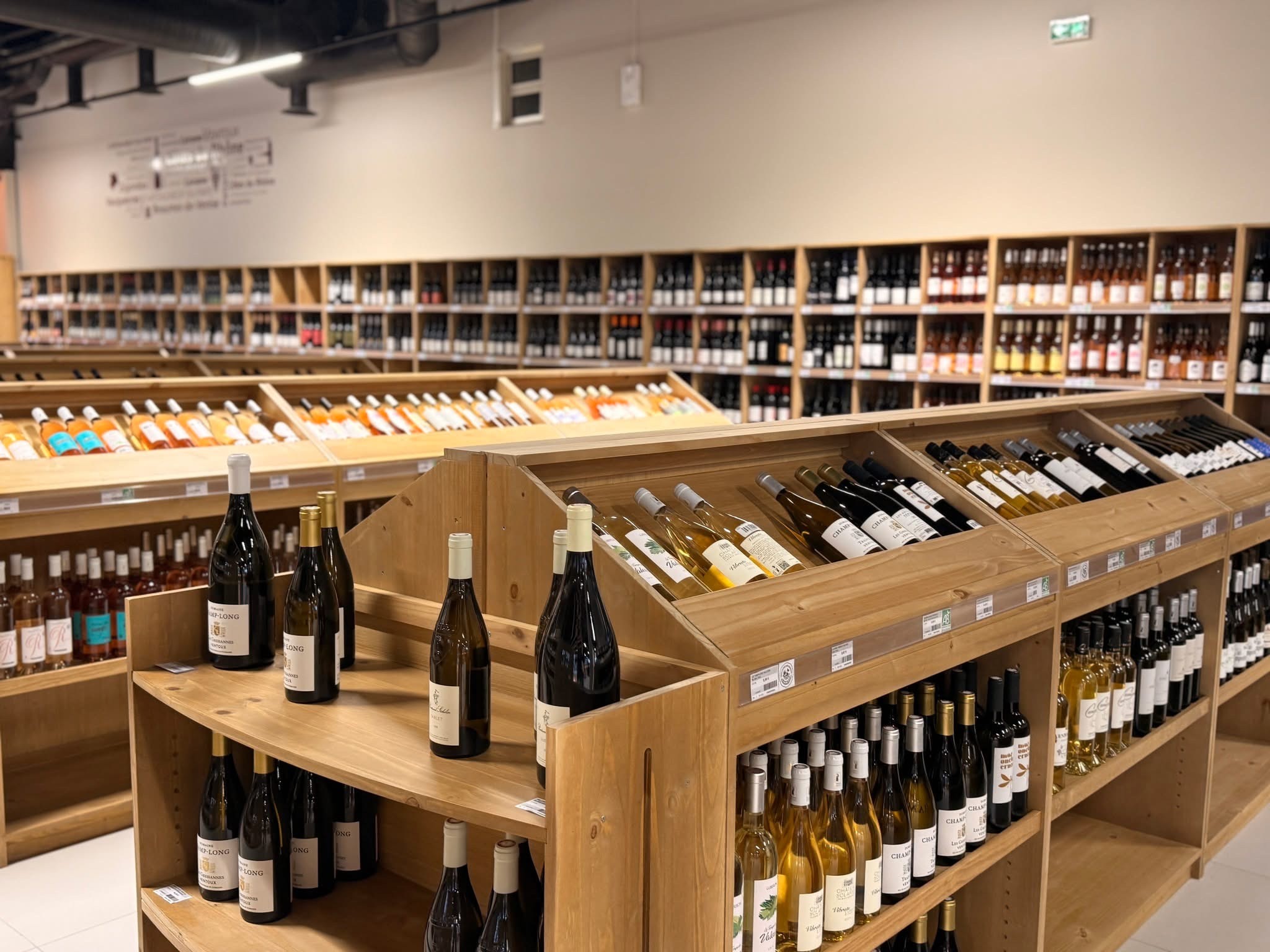 Bienvenue dans l’espace cave XXL de la Maison des Agriculteurs, un lieu qui évoque autant la convivialité que la qualité. Le bois massif change tout : il crée un environnement dans lequel les clients prennent plaisir à flâner, à déguster et à découvrir.